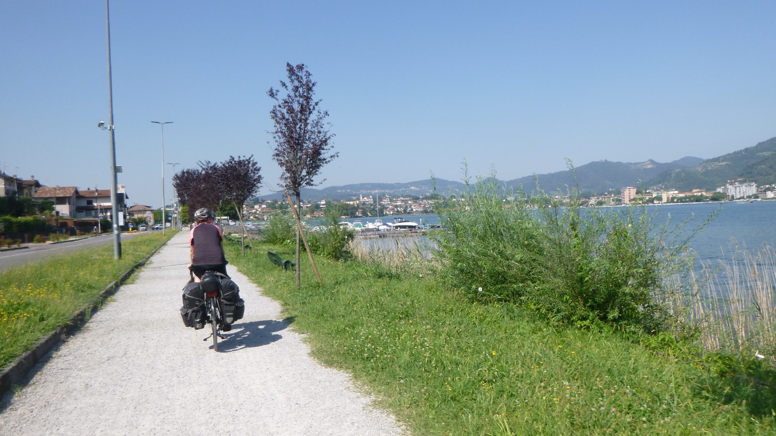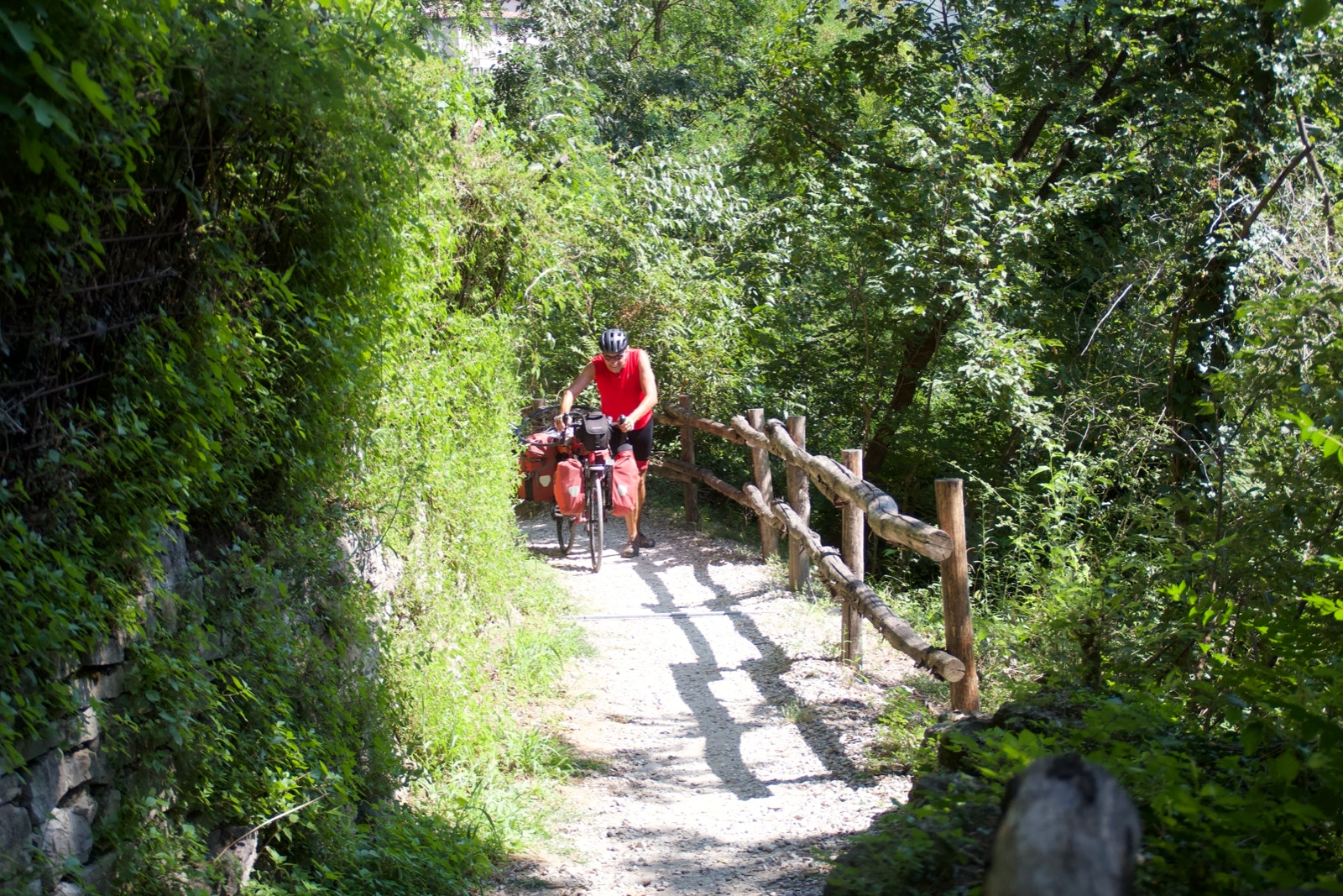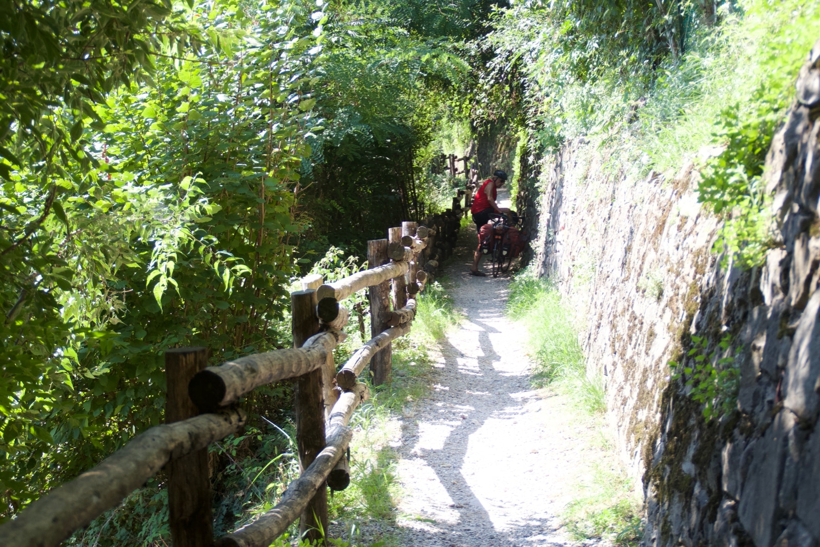 Am Ufer entlang führt ein bequemer Radweg bis Sarnico, ca. 20 Kilometer. Dort überqueren wir den Fluß und folgen diesem auf einem Mountainbikeweg oder besser: Wanderweg. Auf jeden Fall ist der Weg schön, aber nicht unbedingt für beladene Tourenräder gemacht. Wir müssen einige Meter schieben, aber es ist wenigstens recht schattig.