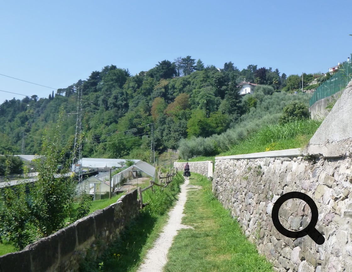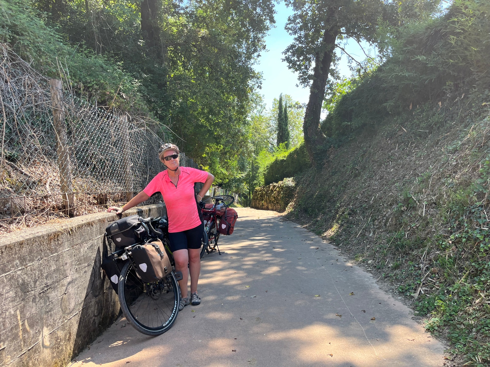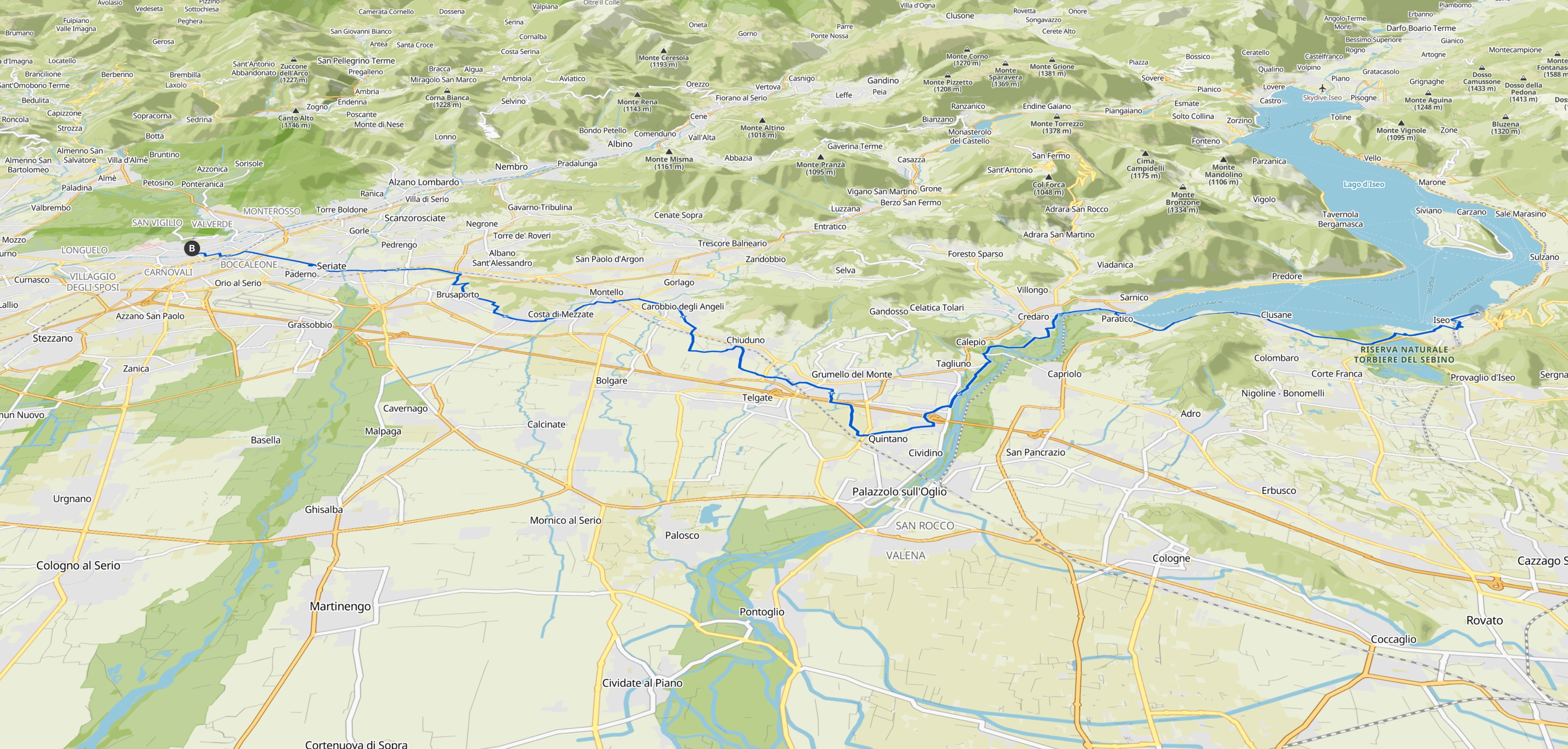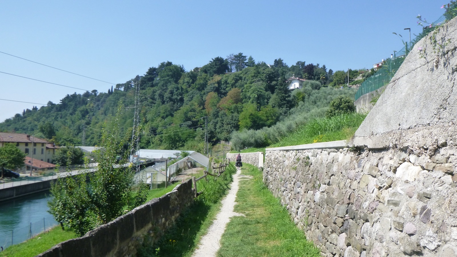 Am Ufer entlang führt ein bequemer Radweg bis Sarnico, ca. 20 Kilometer. Dort überqueren wir den Fluß und folgen diesem auf einem Mountainbikeweg oder besser: Wanderweg. Auf jeden Fall ist der Weg schön, aber nicht unbedingt für beladene Tourenräder gemacht. Wir müssen einige Meter schieben, aber es ist wenigstens recht schattig.