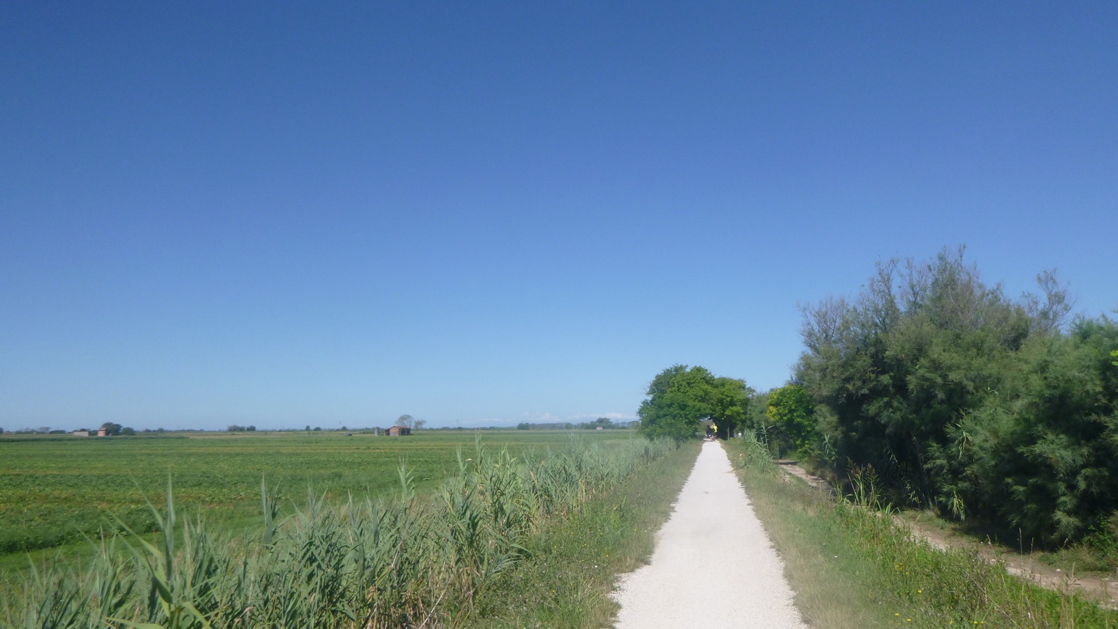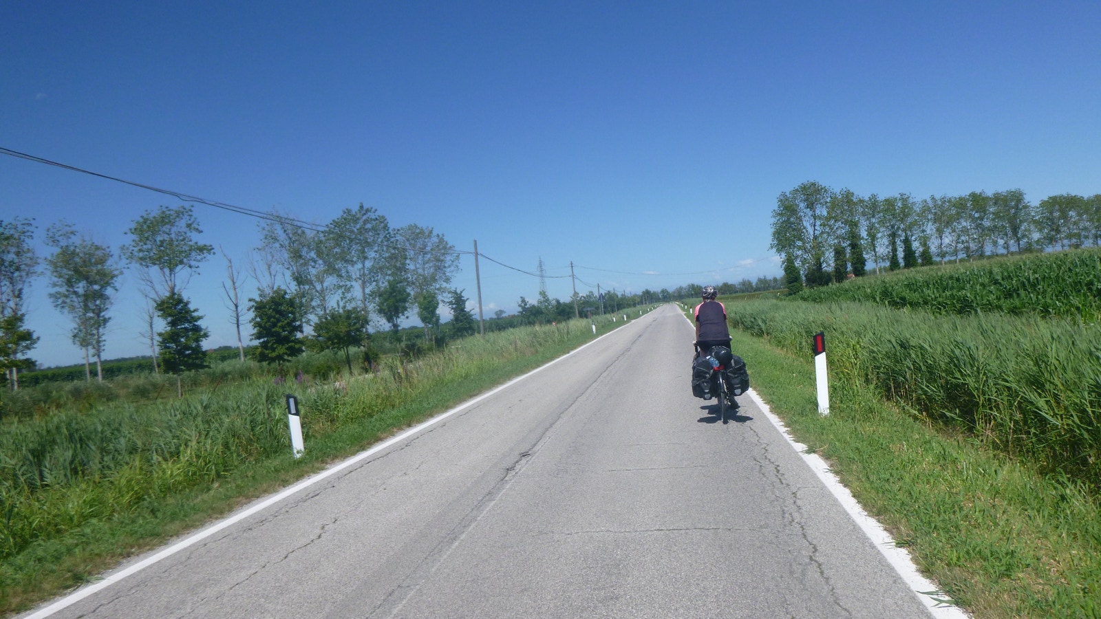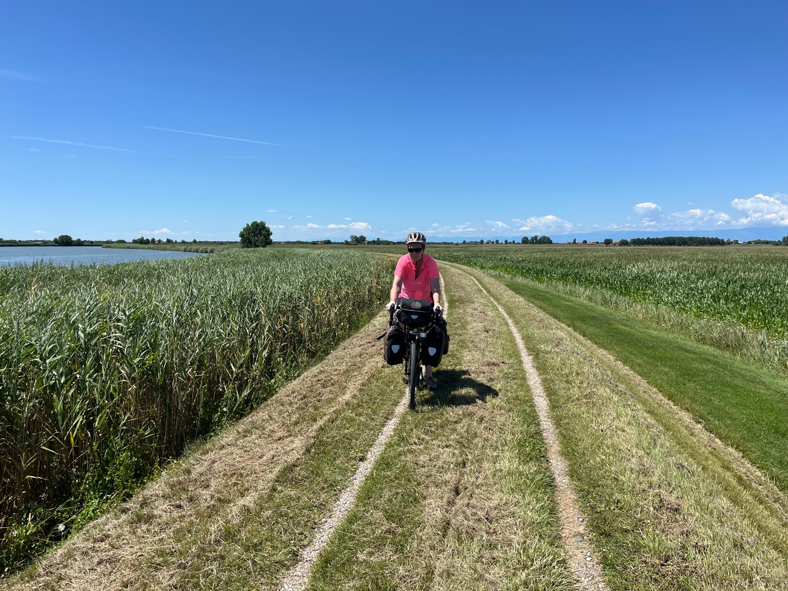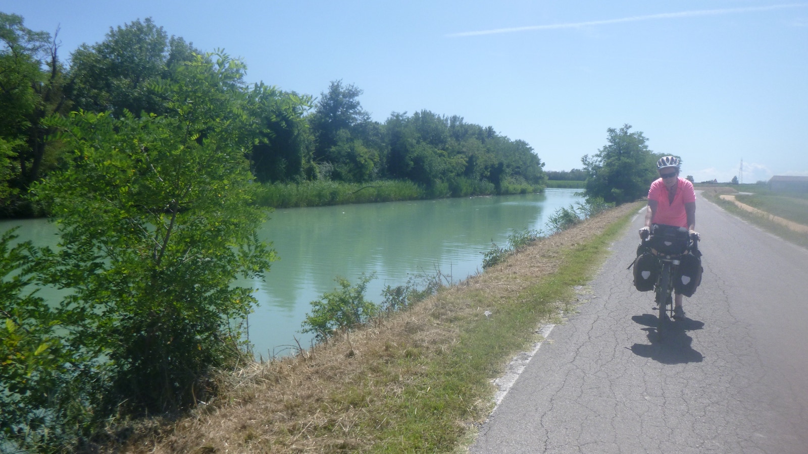 Einige Zeit, nachdem wir in Sindacale wieder auf die ursprüngliche Route treffen, müssen wir bei Bacino Villa von der Straße hinunter und werden kilometerlang auf einem Damm mit ganz schmalen Spurrillen im Gras am Canale dei Lovi entlang geführt. Mit den beladenen Rädern in den schmalen Rillen zu fahren erfordert gute Konzentration und ist wirklich anstrengend. Mittlerweile ist es sehr heiß und wir müssen zwischendurch immer mal wieder im seltenen Schatten pausieren. Trotz der Widrigkeiten genießen wir die malerische Sumpflandschaft.