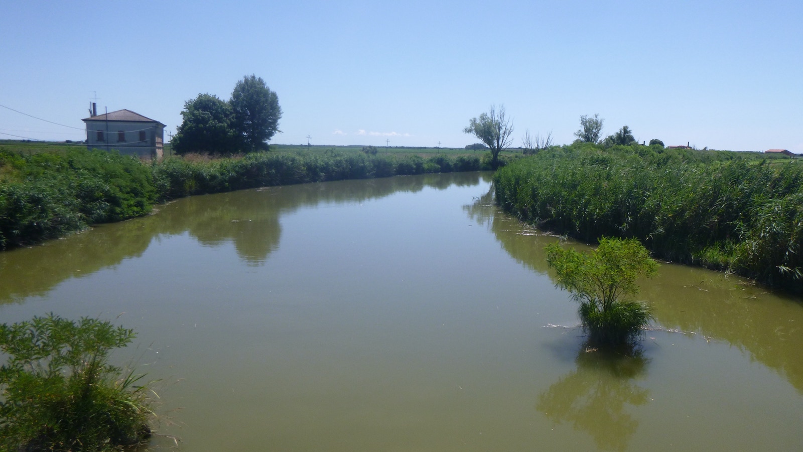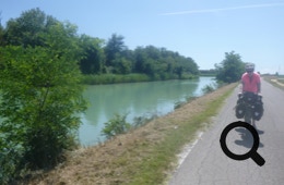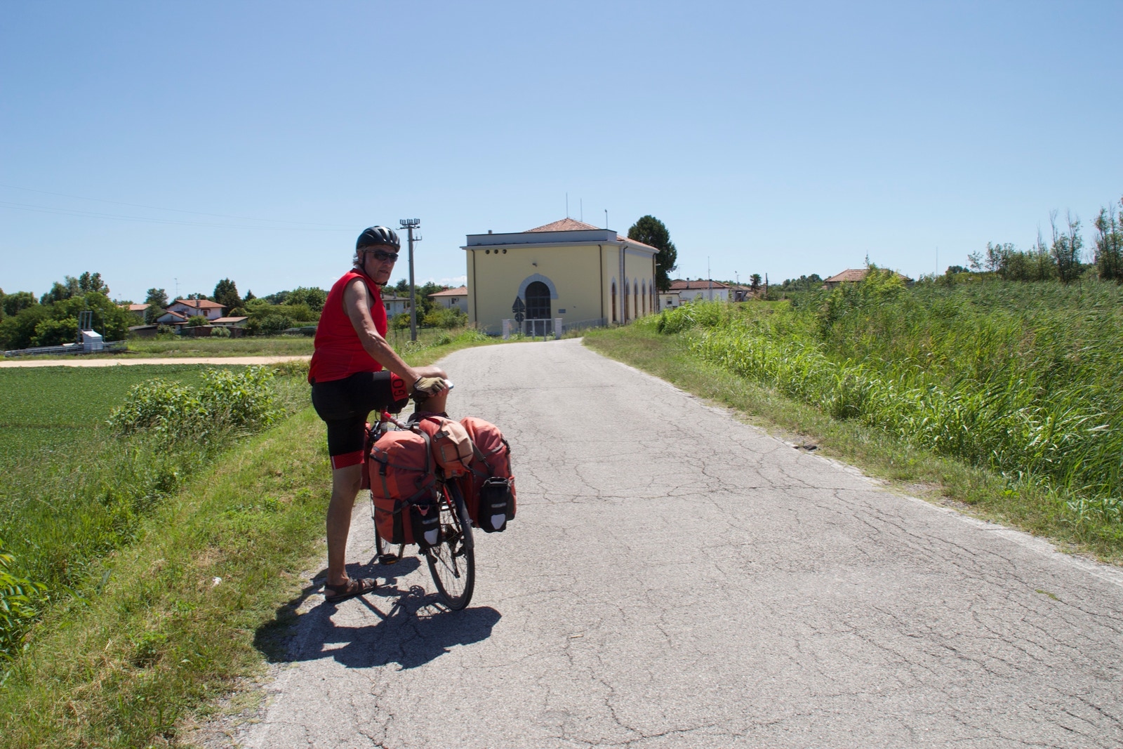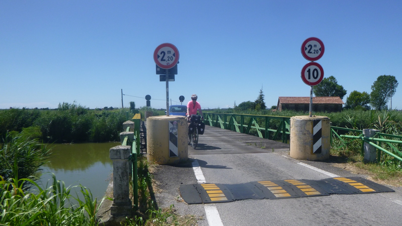 Einige Zeit, nachdem wir in Sindacale wieder auf die ursprüngliche Route treffen, müssen wir bei Bacino Villa von der Straße hinunter und werden kilometerlang auf einem Damm mit ganz schmalen Spurrillen im Gras am Canale dei Lovi entlang geführt. Mit den beladenen Rädern in den schmalen Rillen zu fahren erfordert gute Konzentration und ist wirklich anstrengend. Mittlerweile ist es sehr heiß und wir müssen zwischendurch immer mal wieder im seltenen Schatten pausieren. Trotz der Widrigkeiten genießen wir die malerische Sumpflandschaft.