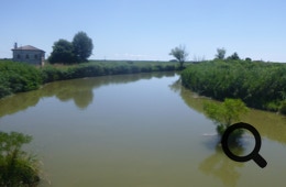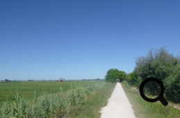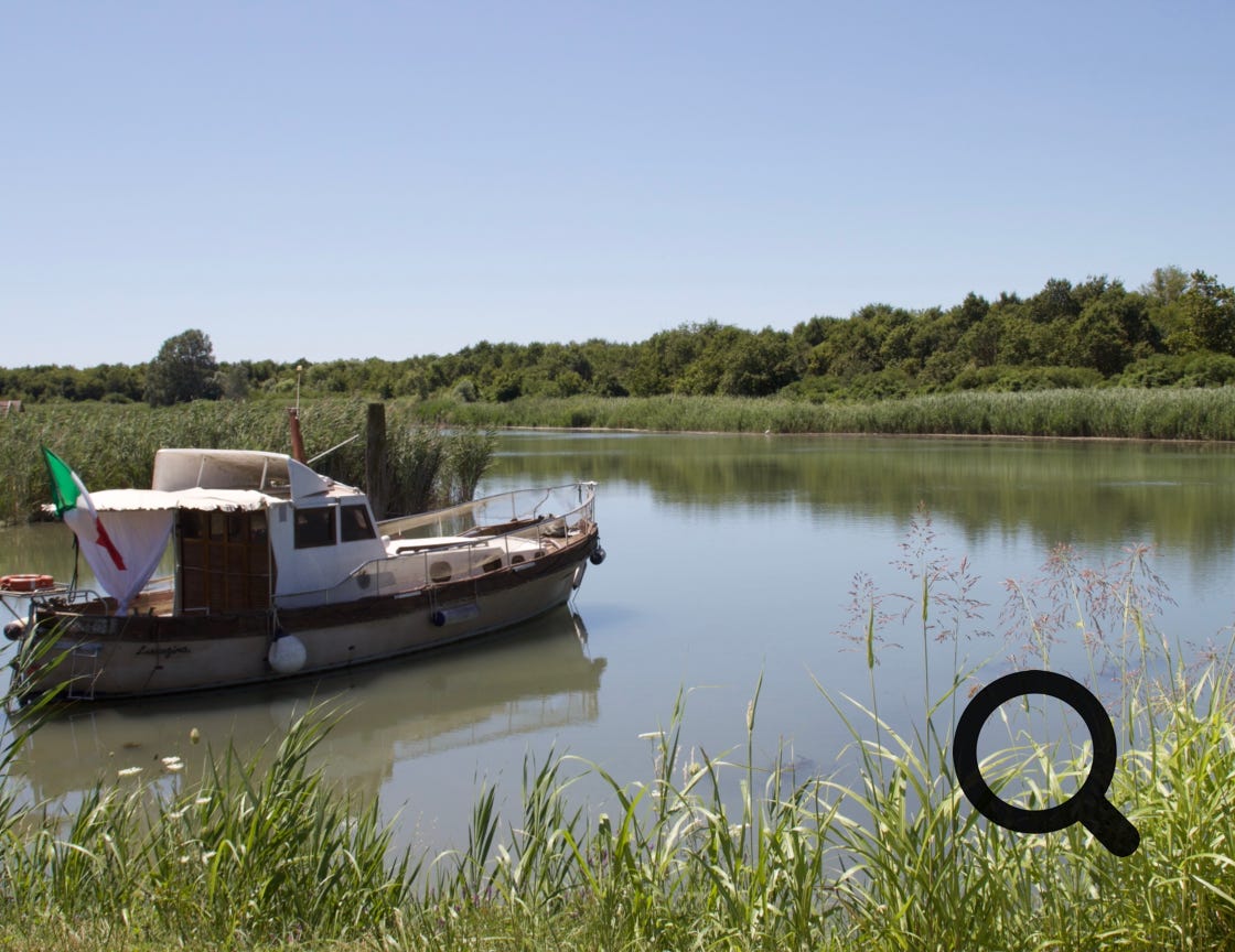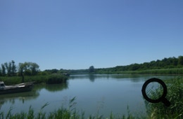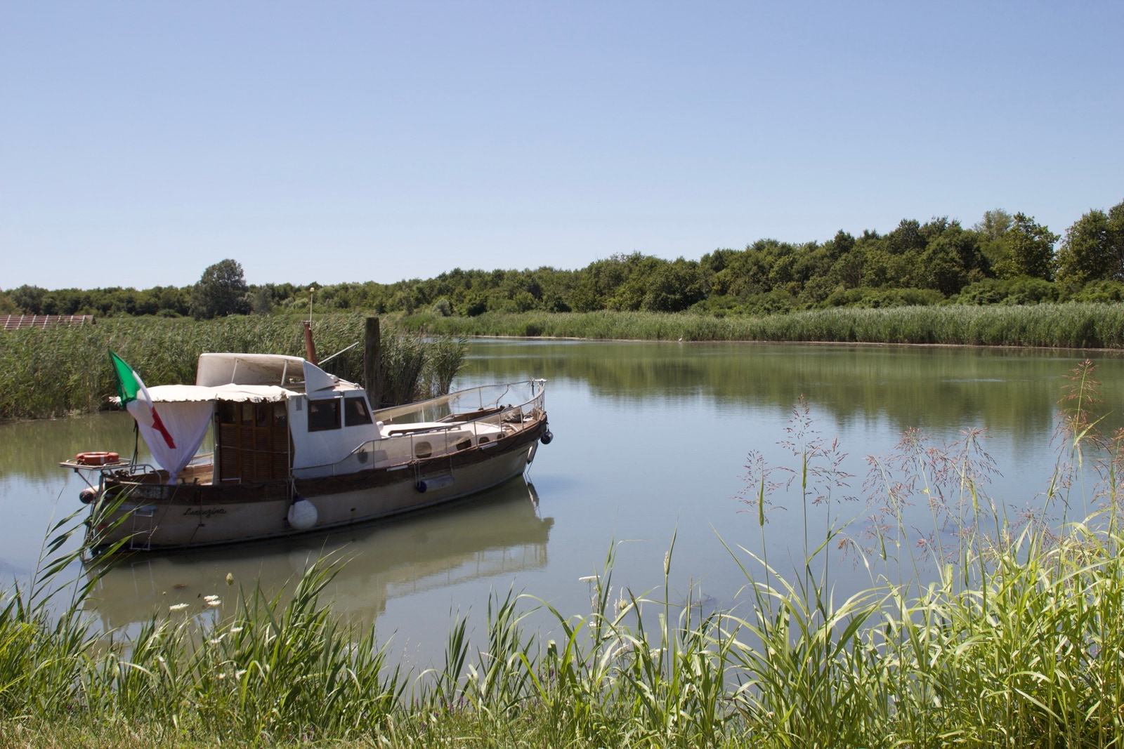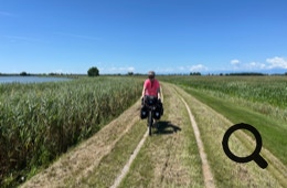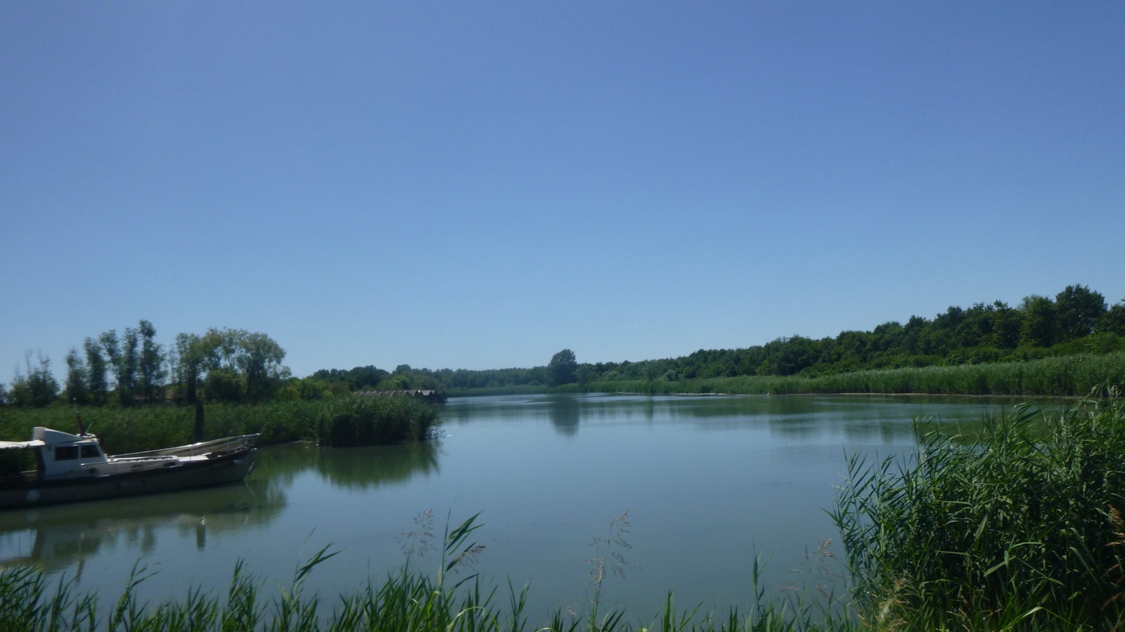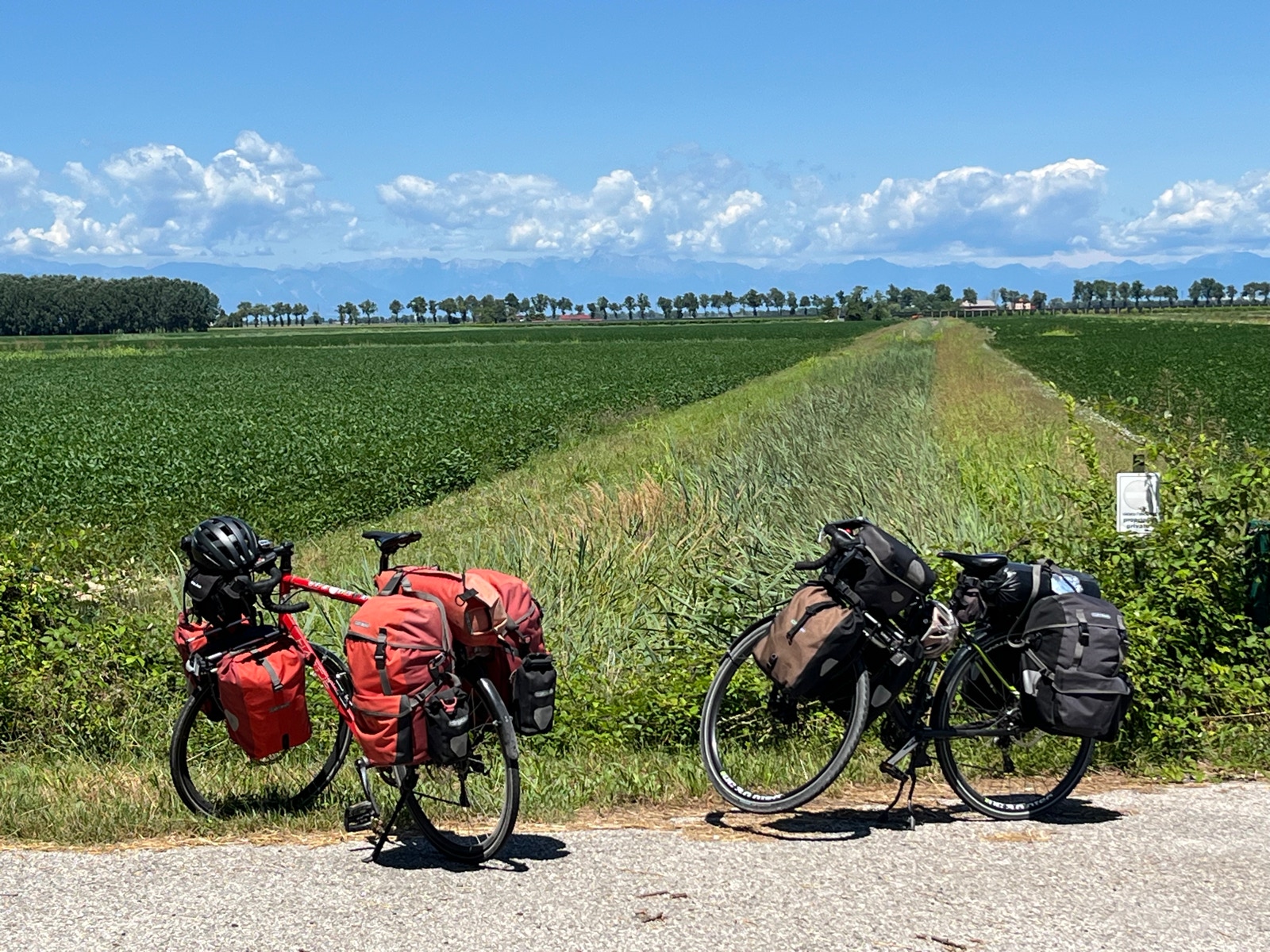 Einige Zeit, nachdem wir in Sindacale wieder auf die ursprüngliche Route treffen, müssen wir bei Bacino Villa von der Straße hinunter und werden kilometerlang auf einem Damm mit ganz schmalen Spurrillen im Gras am Canale dei Lovi entlang geführt. Mit den beladenen Rädern in den schmalen Rillen zu fahren erfordert gute Konzentration und ist wirklich anstrengend. Mittlerweile ist es sehr heiß und wir müssen zwischendurch immer mal wieder im seltenen Schatten pausieren. Trotz der Widrigkeiten genießen wir die malerische Sumpflandschaft.