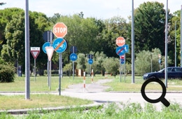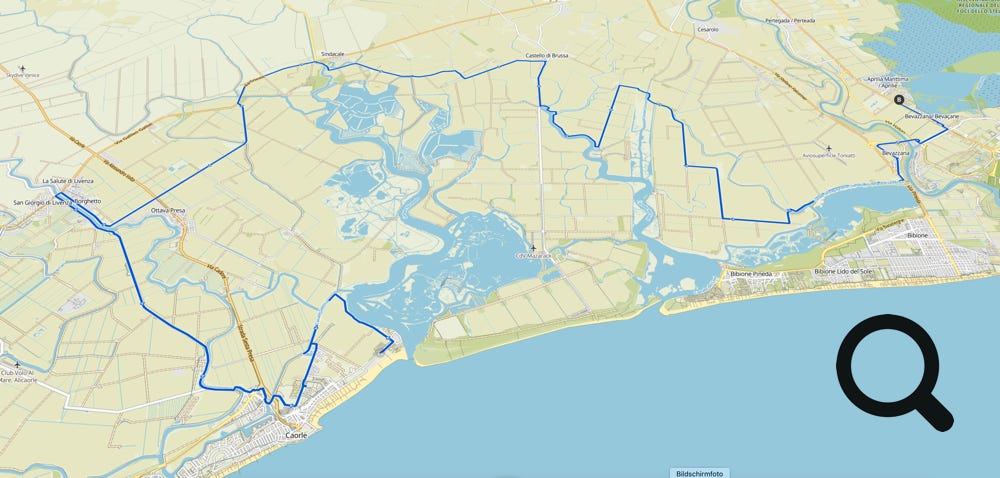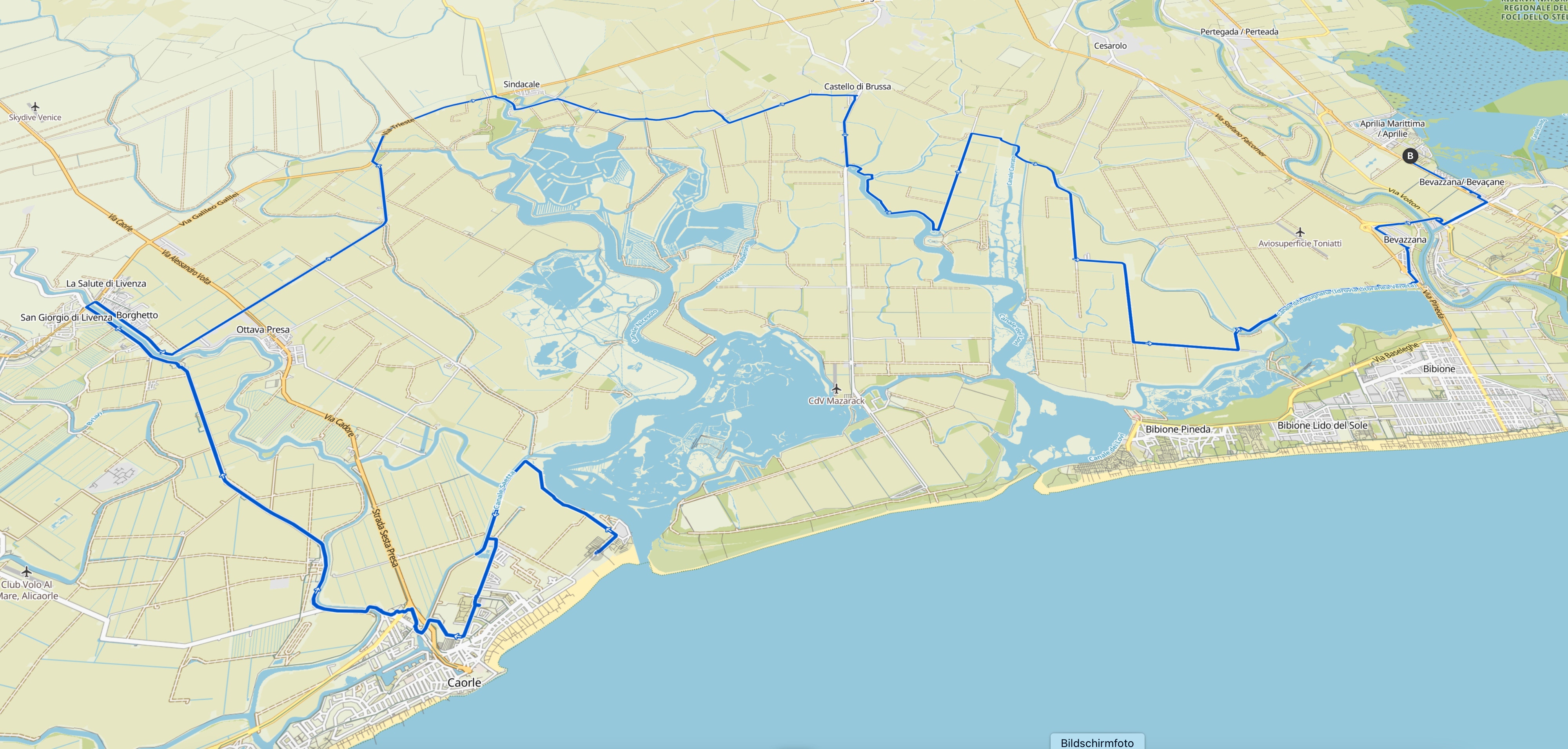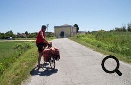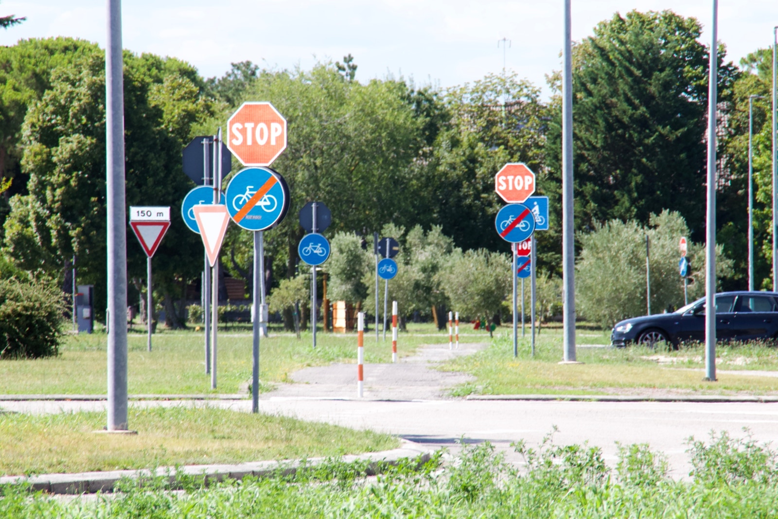 Auf dem vorletzten Teil der Route wird ein neuer Radweg gebaut, direkt neben der verkehrsarmen Straße. Nachdem wir über eine kleine Brücke gefahren sind, erreichen wir nach kurzer Zeit Bevazzana, einen Ort mit einer merkwürdigen Radführung (siehe Foto). Alle 5 Meter steht ein Stopschild für die Radfahrer, damit die Autos Vorfahrt haben dürfen.