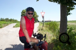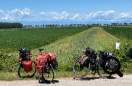 Wir radeln auf endlosen Straßen an Feldern und aufgegebenen Bauernhöfen vorbei. Da hier wenig Verkehr herrscht, läßt es sich aber gut fahren. In einem Geschäft am Weg findet Sabine auch ein neues Kissen.
