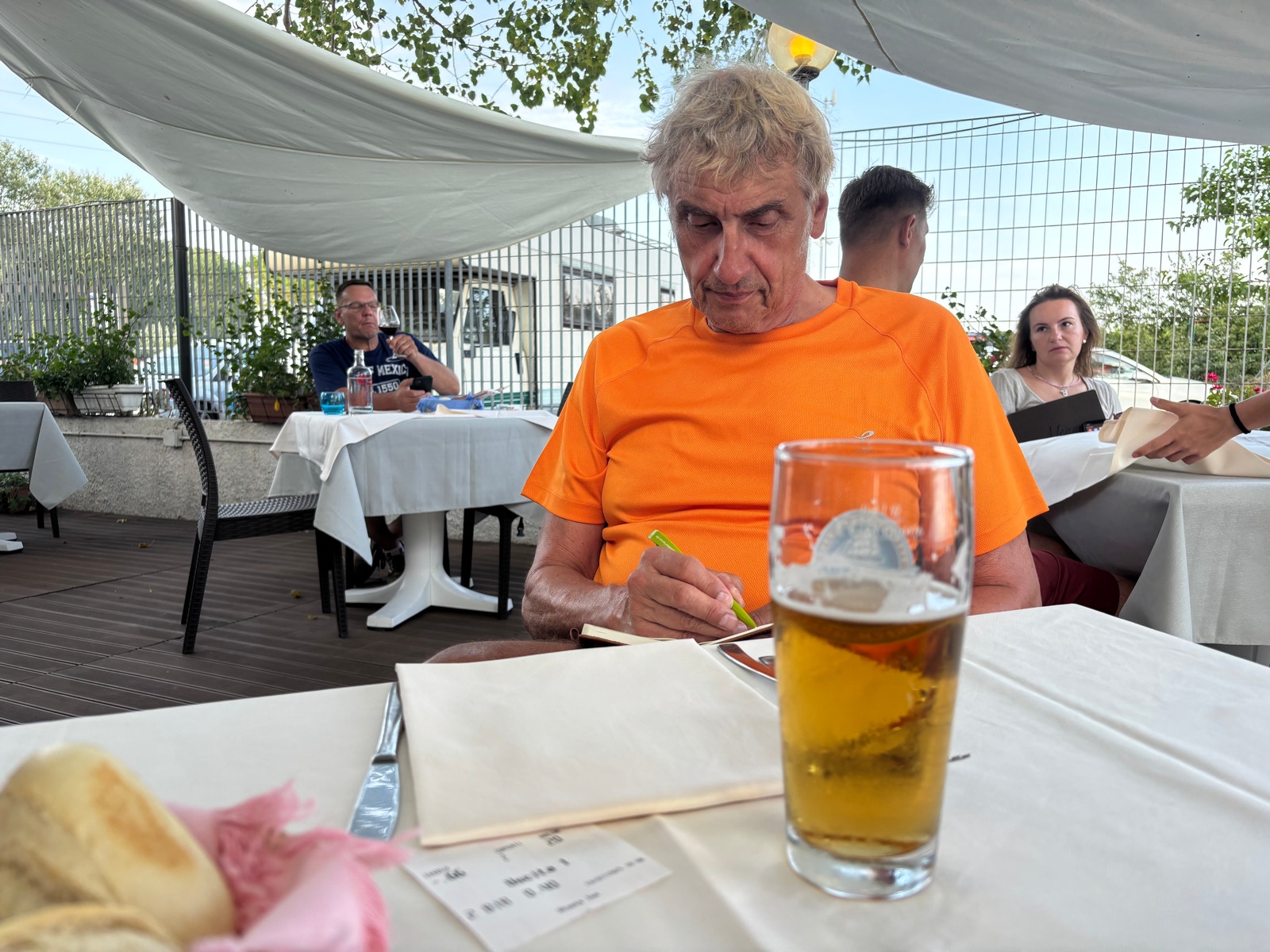 Den Rest des Tage faulenzen wir, lesen und würfeln. Zwischendurch wird die Wäsche abgehängt und einsortiert. Am Abend gehen wir zum zum etwa einen Kilometer entfernten Restaurant „da Piero“.