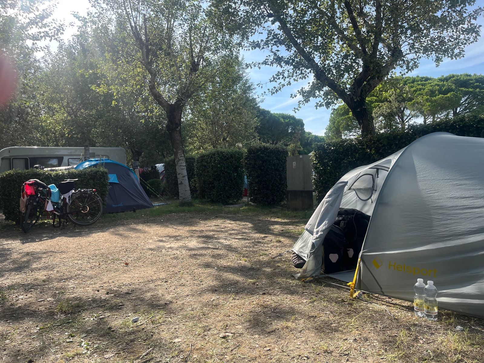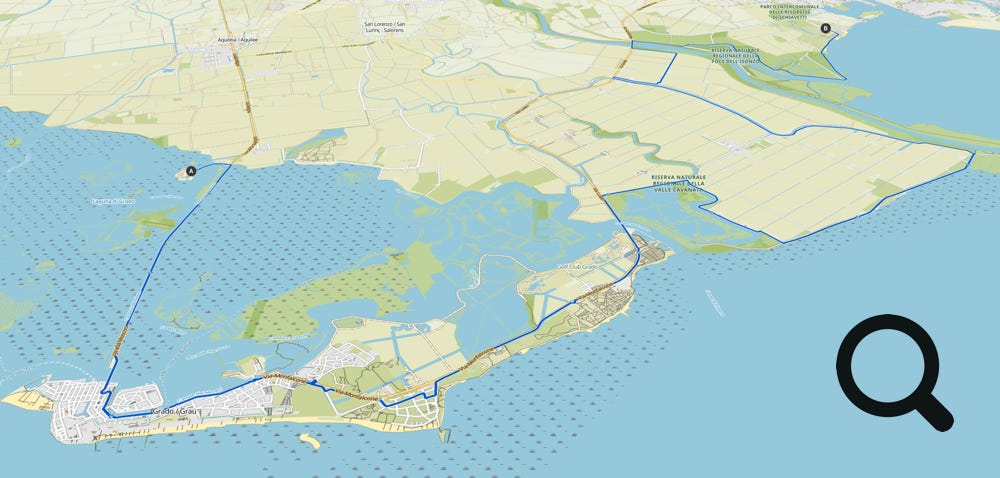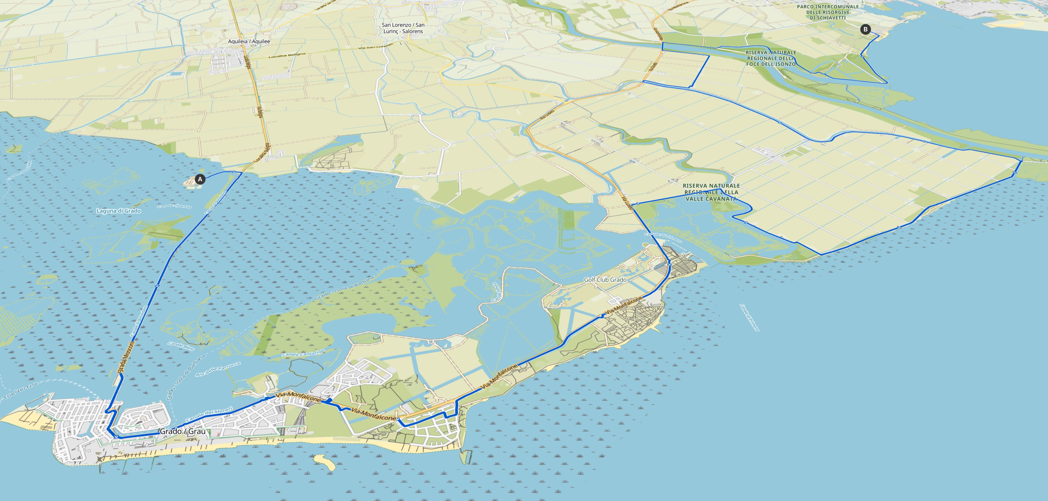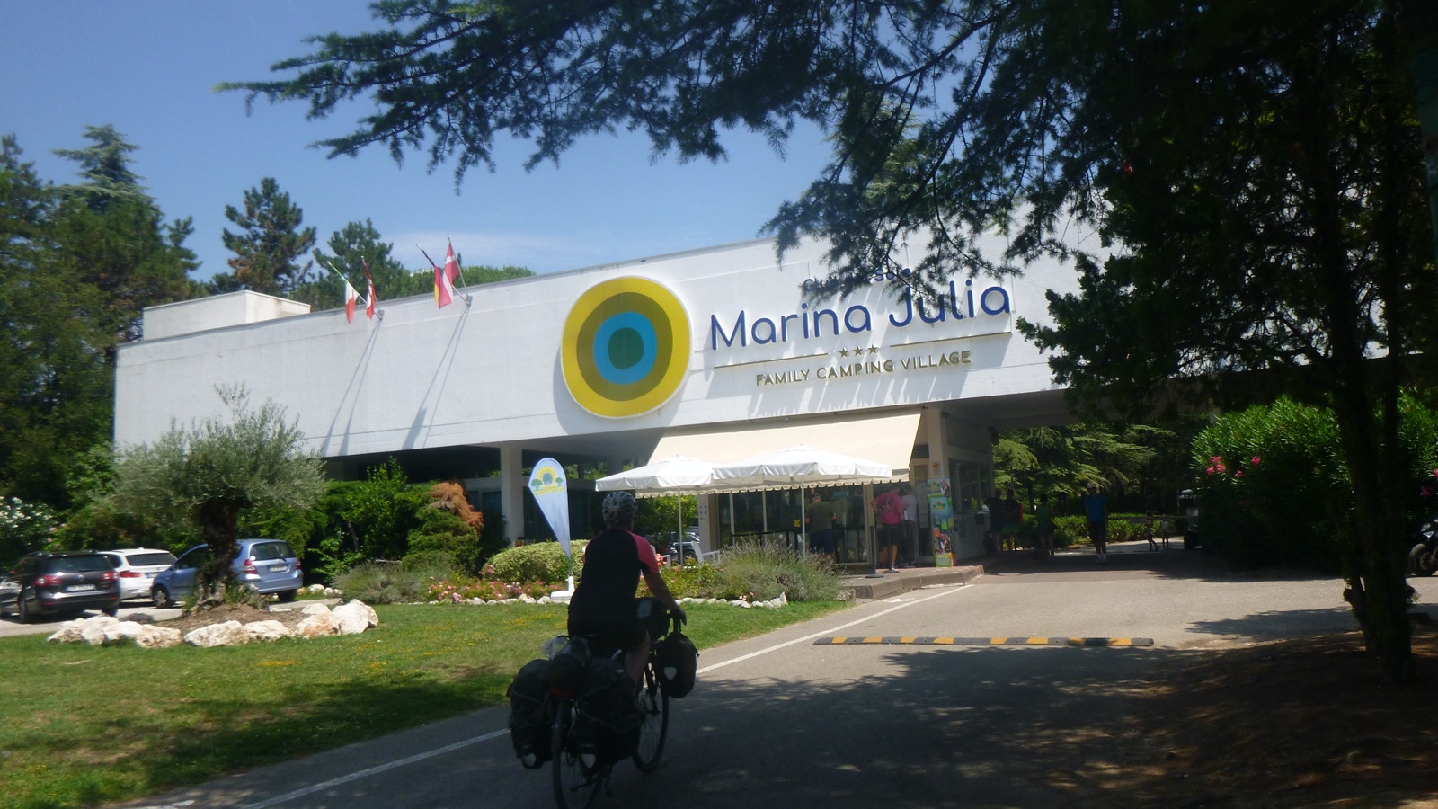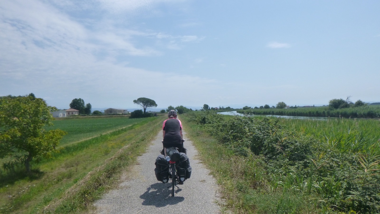 Heute sind wir trotz der gestrigen Party wirklich mal früh und starten um 8:30 Uhr. Es ist zwar schwül, aber keine so stechende Hitze wie sonst am Nachmittag. So können wir entspannt die ersten fünf Kilometer über den Damm nach Grado radeln.