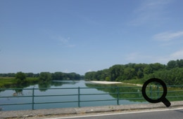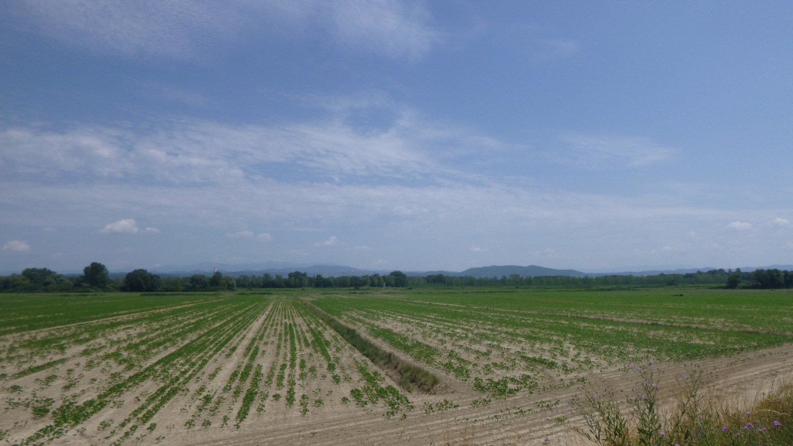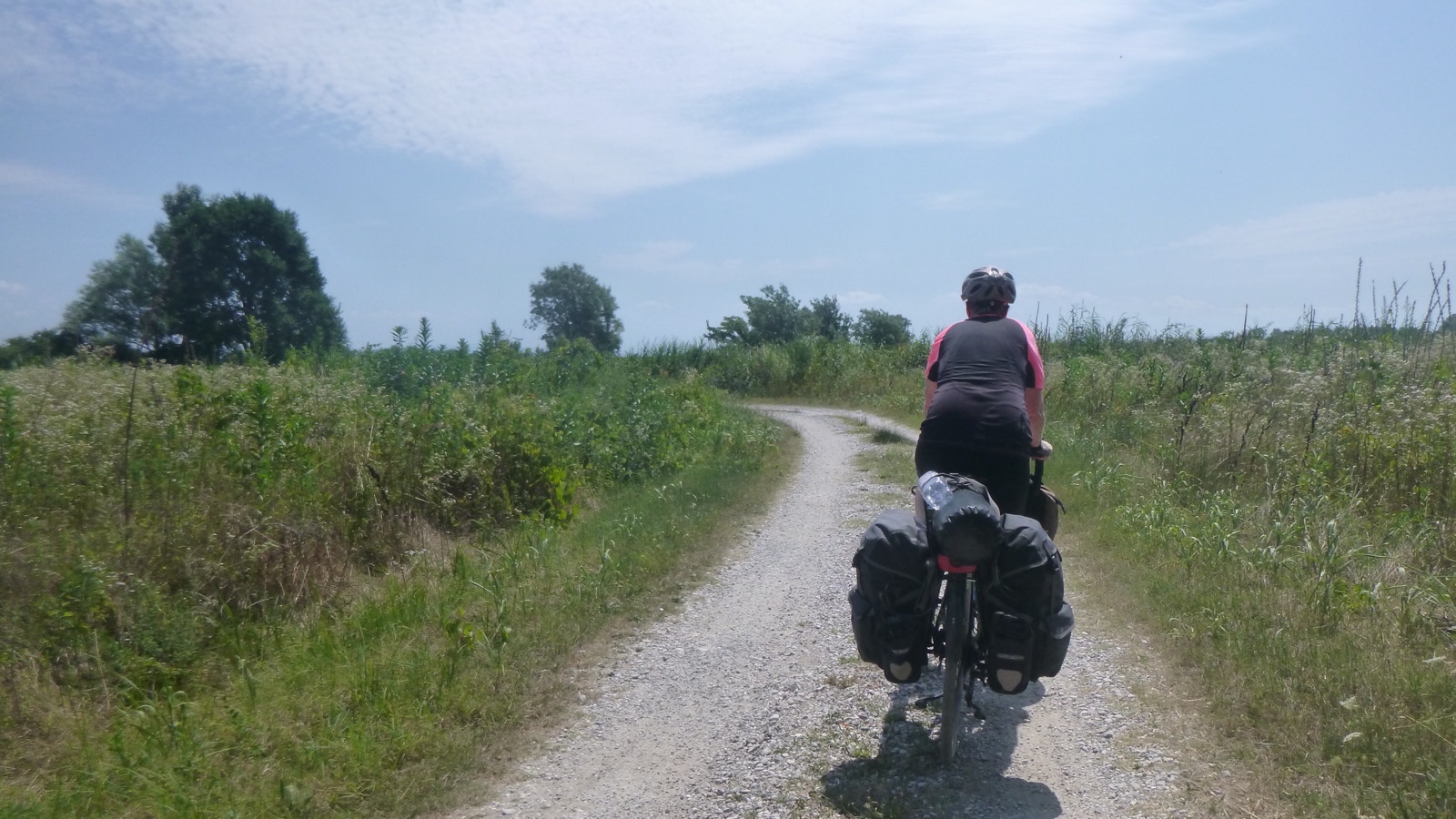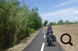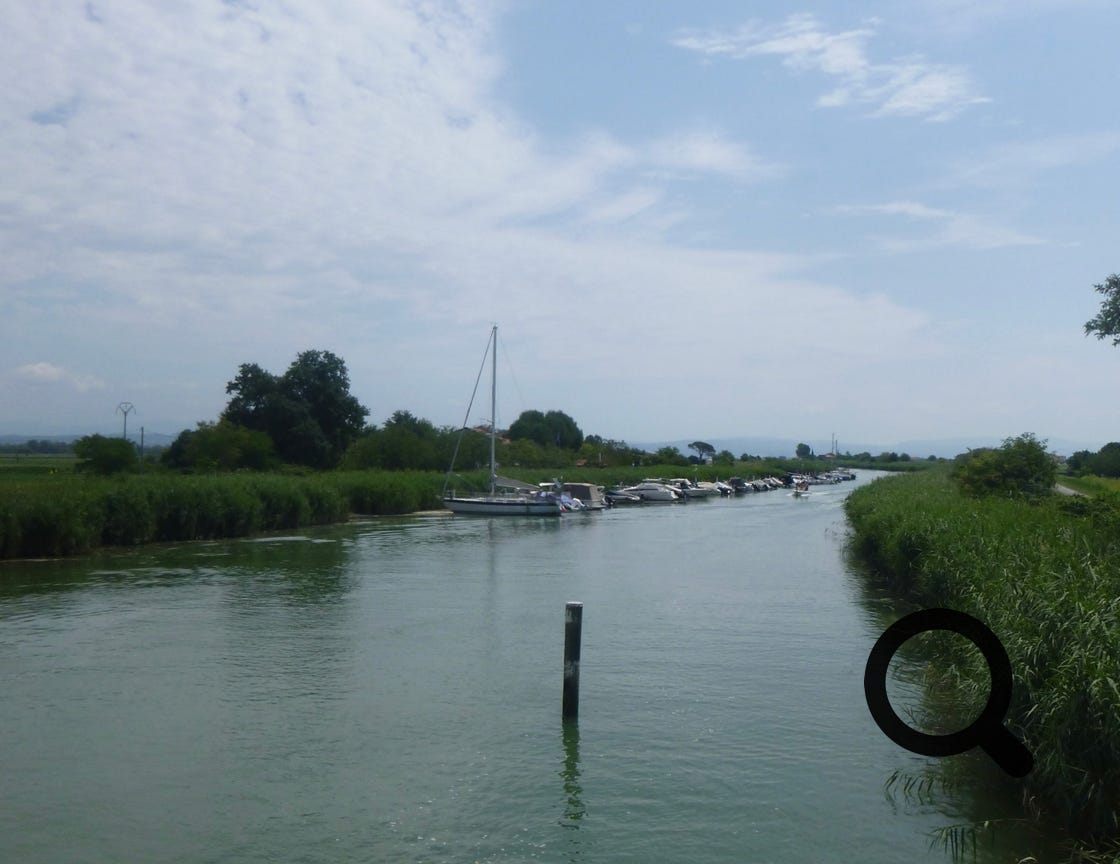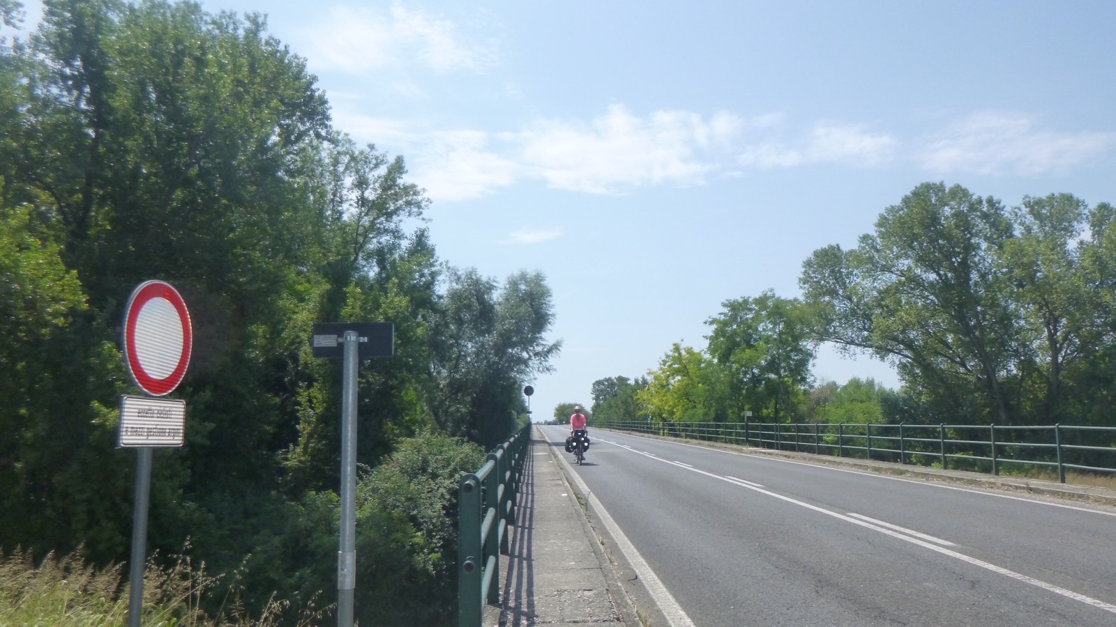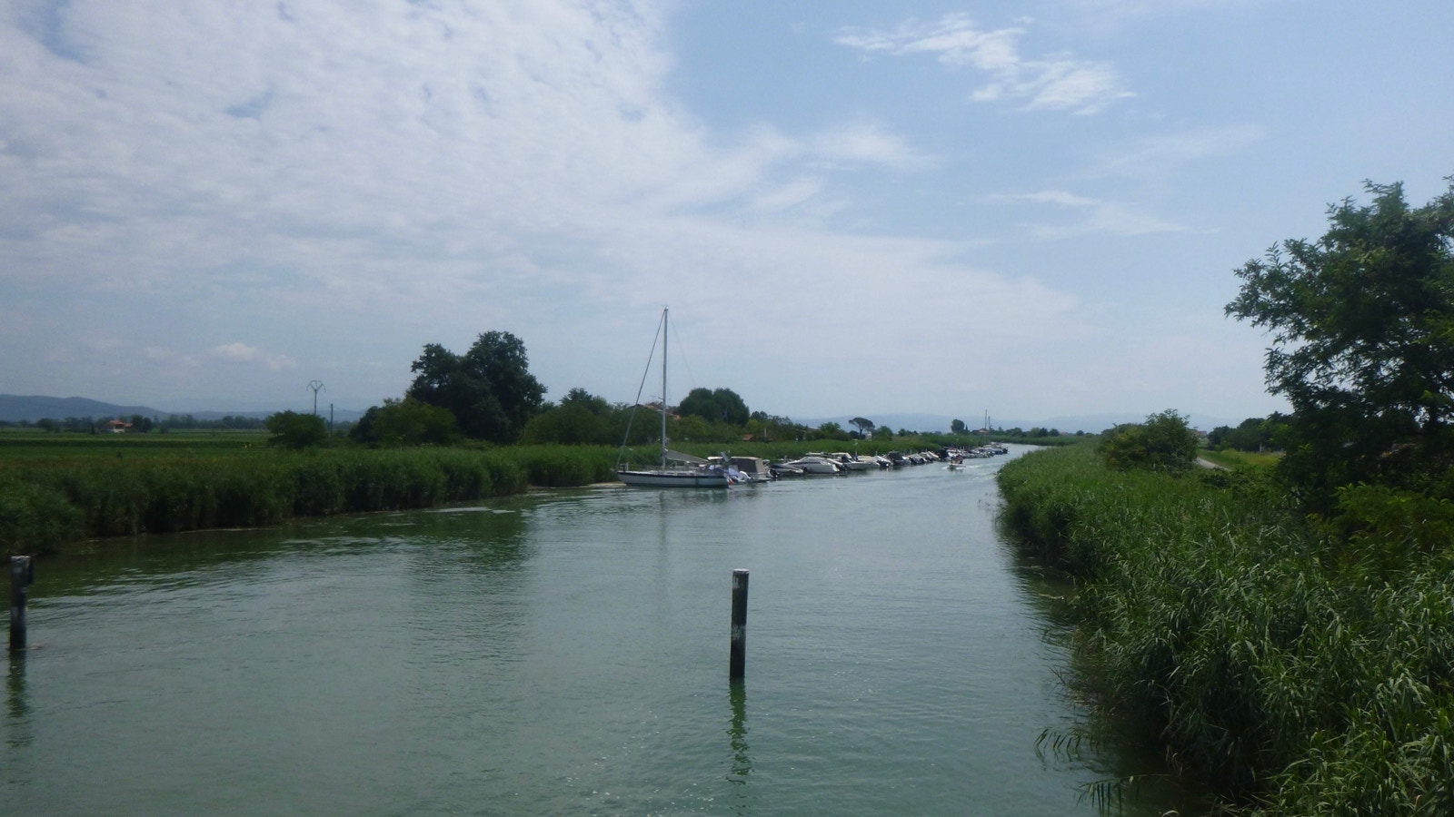 Anschließend nehmen wir den Umweg an der Lagune entlang und trinken eine Cola am „Punta Sdobba“. Ein schönes Hotel und Anlaufpunkt für viele Tagestouristen mit Fahrrädern. Weiter geht es dann am Damm über einen geschotterten Weg. Zweimal überqueren wir Kanäle und landen im Naturpark della Foce del Isonzo. Die Vegetation gönnt uns hier eine einigermaßen schattige Strecke, trotzdem wir es jetzt doch langsam sehr heiß.